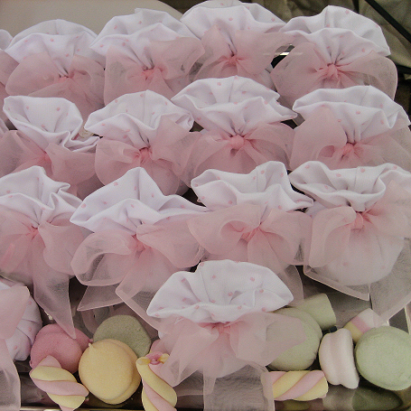 Mi occupo personalmente della realizzazione delle bomboniere e se lo desiderate verrò a casa vostra o presso la location da voi scelta per la cerimonia ad allestirvi un meraviglioso tavolo per la confettata passando da uno stile più romantico e fiabesco ad uno più moderno , il tutto su vostro gusto e desiderio ; per le cerimonie dei più piccini come battesimi e prime comunioni il tavolo potrà essere rallegrato da cestini di raso con biscotti glassati o caramelle dai mille colori racchiuse in un tulle infiocchettato con nastri di raso. Eseguo anche allestimenti di tavoli e location per feste di compleanno di grandi e piccini. Le bomboniere sono interamente realizzate a mano con tessuti di prima qualità quali il lino, cotone, piquet, seta, raso, organza, taffetà, shantung e moirè, così da poter essere facilmente abbinate all’abito da cerimonia inoltre, su richiesta, possono essere ricamare bellissime iniziali. Le bomboniere, a seconda del modello scelto , possono avere diverse forme dal sacchetto alla caramella dal quadrato alla busta ed essere piccole, medie o grandi con la base quadrata o rotonda. Per le cerimonie, in particolar modo quelle dei bambini, possono essere legati al nastro meravigliosi ciondoli in argento anche smaltati inoltre, sempre per i bambini, realizzo sacchetti da utilizzare come porta confetti per le cerimonie realizzati nei tessuti di vostra scelta abbinati alle bomboniere con ricamato il nome del vostro bambino. Molto belli con il ricamo del gusto del confetto per esempio, fragola, arancia, limone ecc. I confetti che utilizzo sono della Pelino di Sulmona rinomata azienda leader fin dal 1783 nella produzione di confetti. Sempre per la presentazione del tavolo della confettata, eleganti cesti in raso con nastri coordinati a vostra scelta da utilizzare come supporto per confetti rifiniti a forma di fiore. Disponibili in due misure. Potranno essere realizzate su richiesta, tovaglie della stessa tonalità delle bomboniere con sovrapposto un vaporoso tutte bianco. Ricordo inoltre la possibilità di realizzare le partecipazioni ed i relativi biglietti da inserire nelle bomboniere, le carte sono della storica cartiera San Marco, le più esclusive ,con possibilità di stampa a secco ,rilievo lucido o il tradizionale e bellissimo stile inglese. Per i piccoli partecipanti alle nozze, coloratissimi sacchetti di tulle con caramelle assortite legati da vaporosi fiocchi di organza. |